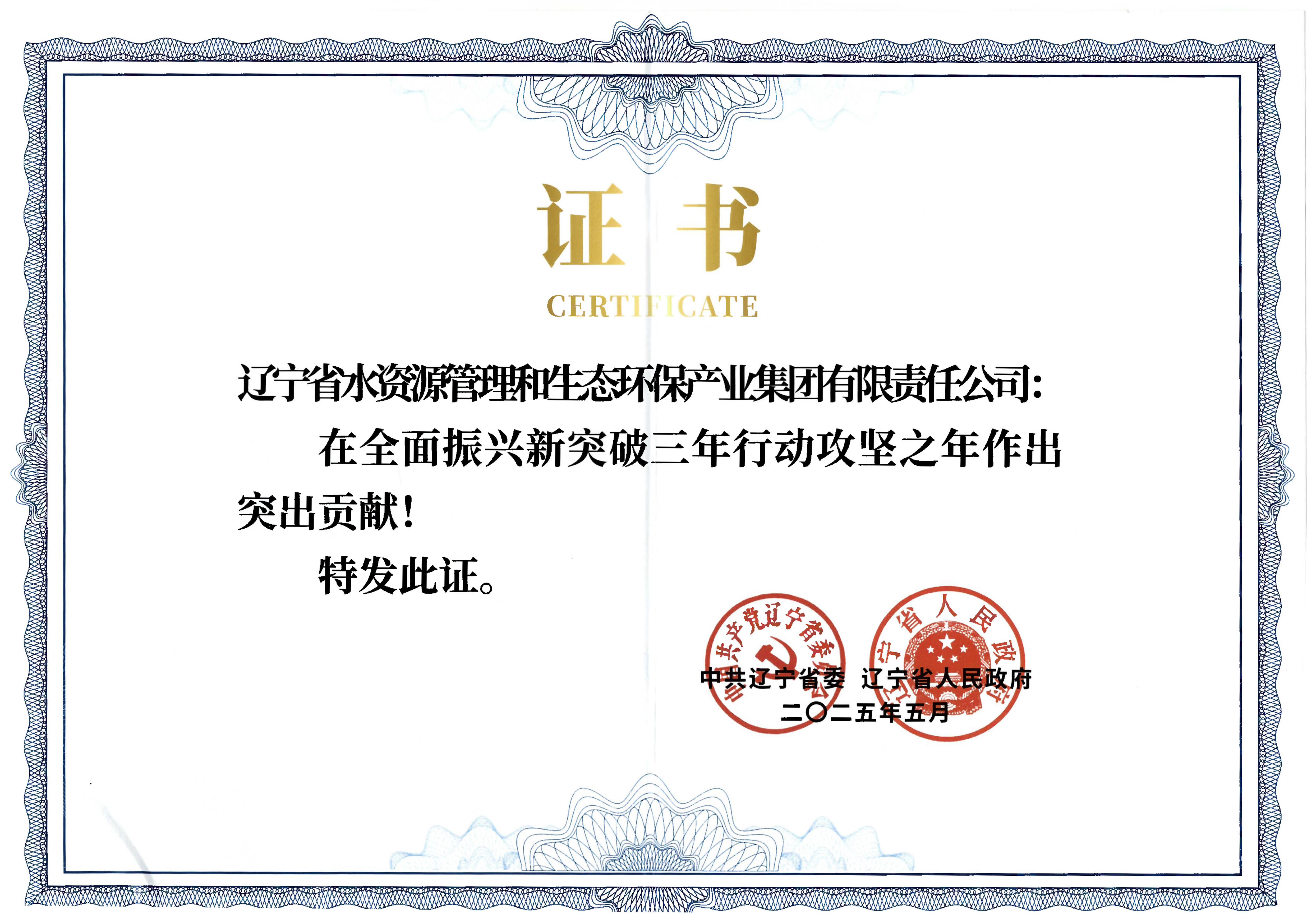 集团荣获辽宁全面振兴新突破三年行动攻坚之年突出贡献企业
